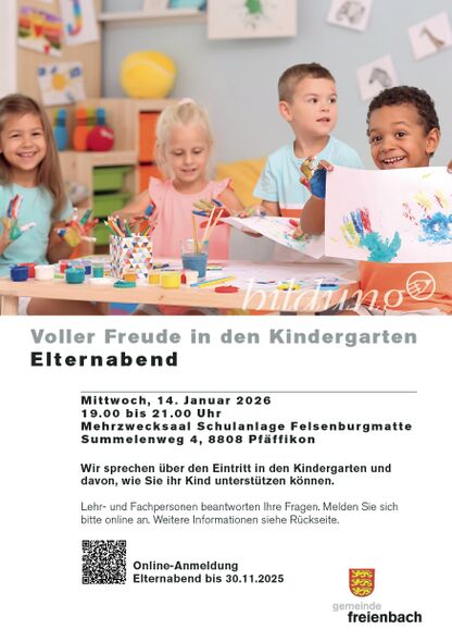 Die Gemeindeschule Freienbach lädt alle Eltern, deren Kinder im August 2026 in den Kindergarten eintreten, herzlich zu einem Informationsabend ein. Der Elternabend findet am Mittwoch, 14. Januar 2026, um 19:30 Uhr im Mehrzwecksaal des Schulhauses Felsenburgmatte in Pfäffikon statt.